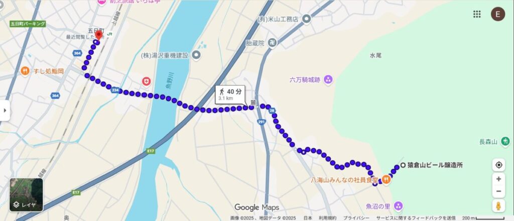 魚沼の里周辺の地図をこまめに見ていると、現在地からJR五日町駅まで徒歩40分で到着することが判明する(上写真参照)