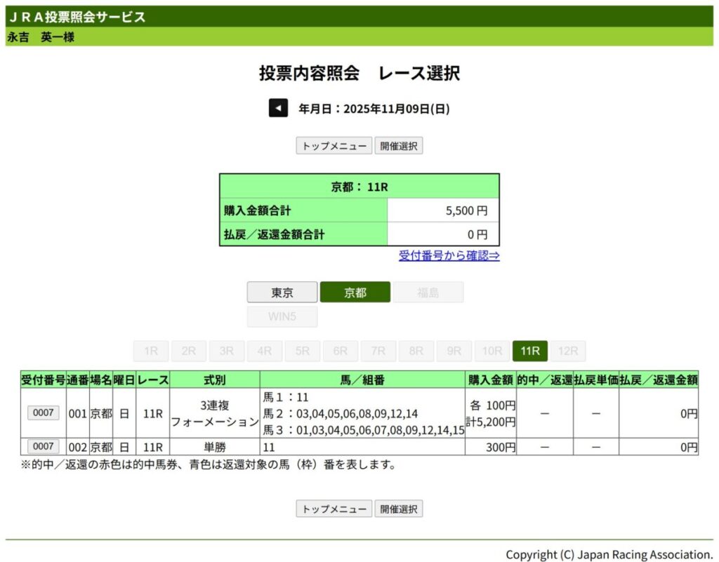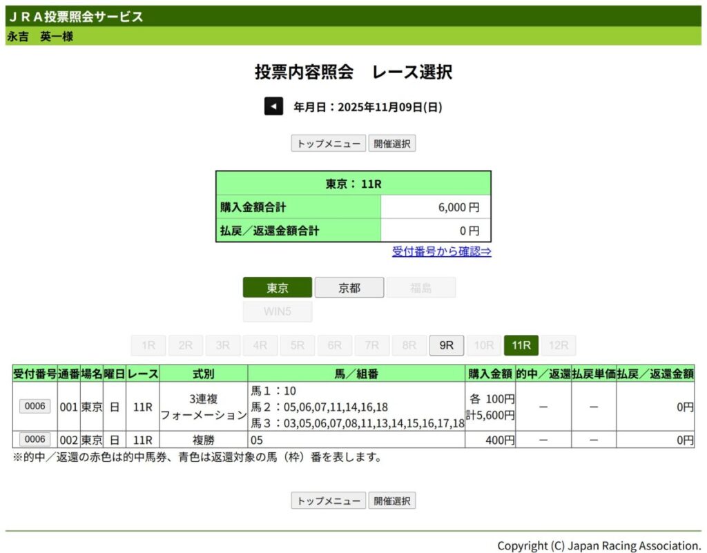 現状の腐っている抽選運ならば、この後に行われるジャパンカップ指定席抽選も落選しそうで、2年連続で秋開催の東京競馬場行きが無くなる可能性大である